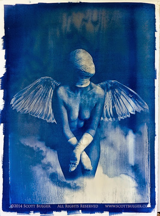90" x 30" constructed image. Cyanotype and gum bichromate on BFK Rives.
